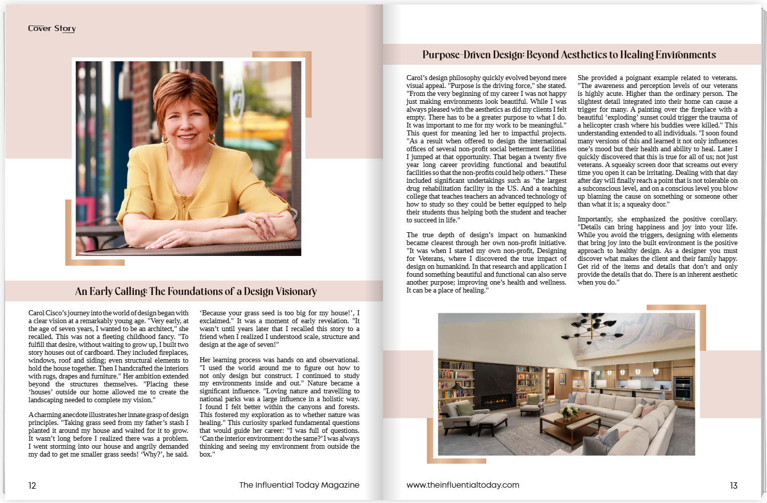 “Carol Cisco’s career is a powerful demonstration of interior design as a force for profound positive change. Her innovative integration of therapeutic principles, her unwavering commitment to purpose driven work and her ability to transform lives through thoughtful, holistic design truly set her apart.
